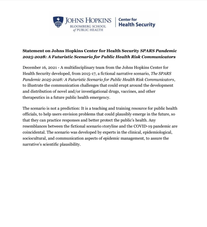 Σενάριο νέας πανδημίας εξετάζει το πανεπιστήμιο JOHNS HOPKINS για την περίοδο 2025 – 2028 τονίζοντας ότι οιαδήποτε ομοιότης με πρόσωπα ή γεγονότα είναι απλά συμπτωματική. Πολλές συμπτώσεις μαζεμένες, ρε παιδιά! Και μάλιστα σατανικές…