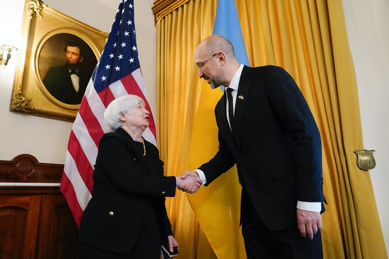 ΕΙΚΌΝΑ AP: Η υπουργός Οικονομικών Τζάνετ Γιέλεν, αριστερά, ανταλλάσσει χειραψία με τον Πρωθυπουργό της Ουκρανίας Ντένις Σμάιχάλ, λίγο πριν τη συνάντησή τους στο Υπουργείο Οικονομικών στην Ουάσινγκτον, την Πέμπτη.