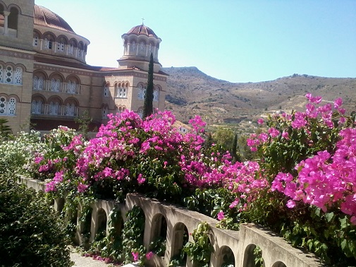 Ο παππούς κατηφόρισε προς τον κάτω μεγαλοπρεπή Ιερό Ναό προς τιμήν του ΑΓΙΟΥ ΝΕΚΤΑΡΙΟΥ, εκεί τον έχασα. Στάθηκα και έβγαλα μια φωτογραφία με τα ανθισμένα λουλούδια για να θυμάμαι αυτό το θρύλο  που έμαθα με τις ΤΡΕΙΣ ΕΛΛΗΝΙΚΕΣ ΠΑΣΧΑΛΙΕΣ.