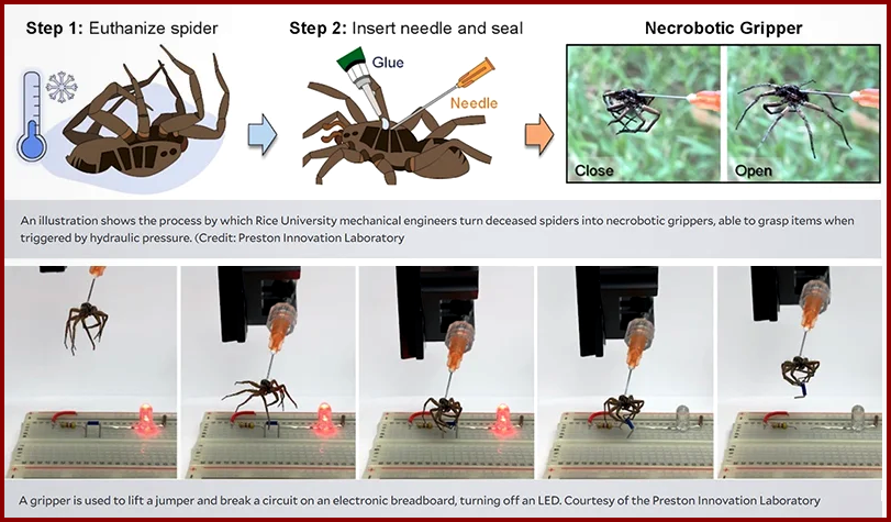 Η ιστορία έχει ως εξής. Οι εκεί επιστήμονες μελέτησαν τις ιδιότητες των ποδιών της αράχνης και έκαναν το εξής πείραμα. Σκότωσαν μία αράχνη με ευθανασία με το να την εκθέσουν σε θερμοκρασία κατάψυξης (περίπου -4οC) για μια περίοδο 5-7 ημερών και εν συνεχεία έκχυσαν μια ειδική κόλα στο σώμα της αράχνης. Αφήνοντας τη σύριγγα στη θέση της και προσθέτοντας ή αφαιρώντας την ειδική κόλλα, οι ερευνητές μπόρεσαν να κάνουν τα πόδια της αράχνης να συστέλλονται και να εκτείνονται. Χρησιμοποίησαν έτσι τα πόδια της αράχνης ως λαβίδες για την μεταφορά ελαφρών αντικειμένων. Και όχι μόνο αυτό, μπόρεσαν να πιάσουν αντικείμενα ακανόνιστου γεωμετρικού σχήματος.