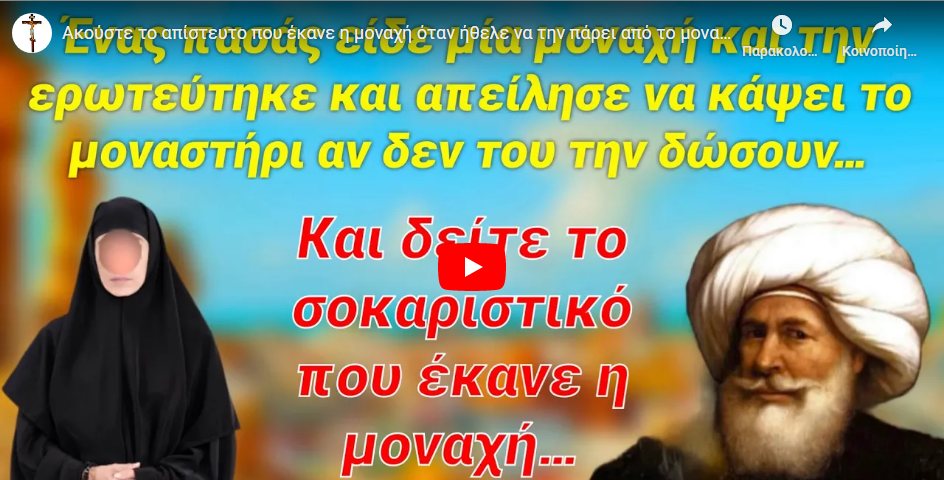 ΑΜΑΡΤΩΛΩΝ ΣΩΤΗΡΙΑ Ακούστε το απίστευτο που έκανε η μοναχή όταν ήθελε να την πάρει από το μοναστήρι ένας πασάς Last updated: 2 Δεκεμβρίου 2022 12:27 By mike 403 Views Share 0 Min Read SHARE Ο πασάς απείλησε να κάψει το μοναστήρι αν δεν του δώσουν την μοναχή, εκείνη όμως έκανε το απίστευτο… add TAGGED:slide Share This Article Facebook Copy Link Previous Article Δεν το ξεχνώ.. Next Article Άγιος Πορφύριος – Τώρα που ακόμα έχω τας φρένας μου σώας θέλω να σας πω μερικές συμβουλές… – Μικρό Αφιέρωμα Δεν υπάρχουν Σχόλια Αφήστε μια απάντηση Ακύρωση απάντησηςΓια να σχολιάσετε πρέπει να συνδεθείτε. FacebookLike Διαβάζονται Τώρα ΠΡΟΦΗΤΕΙΕΣ ΤΟΥ ΜΙΚΡΟΥ ΡΩΣΟΥ ΑΓΓΕΛΟΥ ΟΤΡΟΚ ΒΙΑΤΣΕΣΛΑΒ (ΣΛΑΒΟΤΣΚΑ) Κάποτε ένας φτωχός άνθρωπος ρώτησε τον γέροντα… Γιατί είμαι τόσο φτωχός; Το μπαχαρικό κάρυ σκοτώνει τα καρκινικά κύτταρα Γέροντας Βασίλειος Καυσοκαλυβίτης: «Οἱ Ἕλληνες ἂν δὲν μετανοήσουν θὰ πληρώσουν βαρὺ τίμημα» Νύχτα ήταν που έφυγε. Δεν άντεχε άλλο. Εκείνη νόμισε πως θα παντρεύονταν έναν άντρα να κάνει οικογένεια κι όχι να την δέρνει, να την διατάζει κι αυτή να υπακούει. Τότε ο Μιχαήλ (Αρχάγγελος) που θα είναι δίπλα στον Βασιλιά Ιωάννη, θα του πει.. «Από το “κατ’ εικόνα” στο “προϊόν με copyright”: Ο μετανθρωπισμός υπόσχεται αθανασία, αλλά πουλάει απόλυτη δουλεία στους όρους χρήσης» «Tίς είδε νεκρόν φυλαττόμενον; μάλλον δε τίς είδε νεκρόν πολεμούμενον; » Άγιε Λάζαρε – Ύμνος Τραγούδι