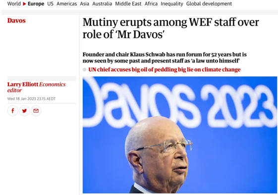 Κι έρχεται και η σηµερινή µέρα, όπου ένα ΦΑΡΜΑΚΕΡΟ άρθρο του διακεκριµένου δηµοσιογράφου Larry Elliott που δηµοσιεύει ο Guardian, βγαίνει στο διαδίκτυο, κάνοντας το κυριολεκτικά άνω-κάτω! Ο Elliott, επικαλείται µαρτυρίες από µια οµάδα νύν και πρώην εργαζοµένων του Φόρουµ, η οποία, σύµφωνα µε τον δηµοσιογράφο, περνά από…στεγνό καθάρισµα τόσο τον ίδιο τον Σβάµπ, όσο και τον … συρφετό του (υπονοώντας – χωρίς να αναφερθεί το όνοµα του – ακόµη και τον ίδιο τον Χαράρι) αλλά και τους … “παγκόσµιους ηγέτες” που προσκυνάνε το Φόρουµ, χαρακτηρίζοντας τους µε πολύ βαριά λόγια!