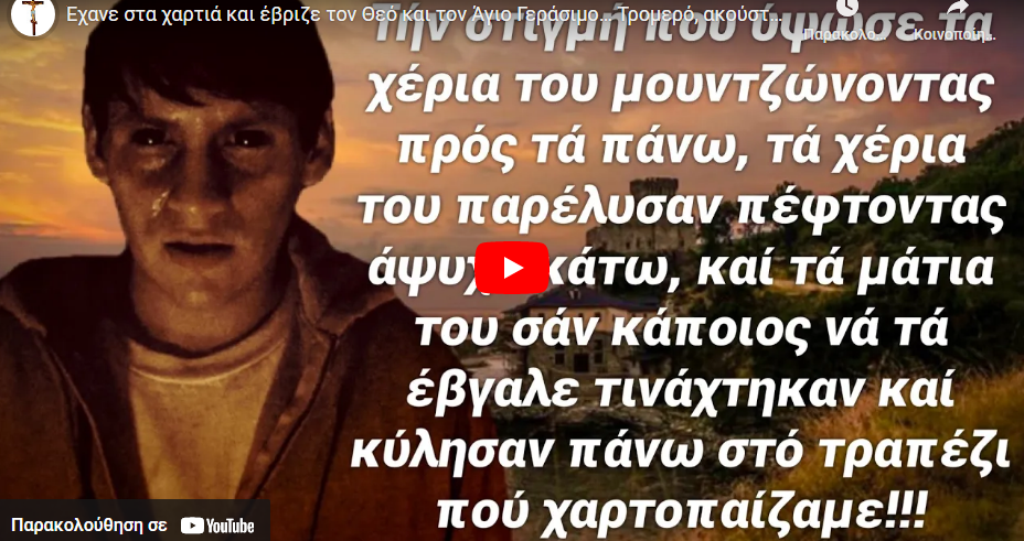 ΔΙΔΑΚΤΙΚΕΣ ΙΣΤΟΡΙΕΣ Έχανε στα χαρτιά και έβριζε τον Θεό και τον Άγιο Γεράσιμο… Τρομερό, ακούστε το και διαδώστε το! Last updated: 13 Μαρτίου 2023 19:30 By mike 284 Views Share 0 Min Read SHARE Έχανε στα χαρτιά και έβριζε τον Θεό και τον Άγιο Γεράσιμο… Τρομερό, ακούστε το και διαδώστε το! add TAGGED:slide Share This Article Facebook Copy Link Previous Article Πώς ωφελήθηκε από την απάντηση μιας πόρνης; Όσιος Εφραίμ ο Σύρος Next Article Ο καθηγητής του Πολυτεχνείου και το θαύμα που έζησε κοντά στον Άγιο Πορφύριο…. Δεν υπάρχουν Σχόλια Αφήστε μια απάντηση Ακύρωση απάντησηςΓια να σχολιάσετε πρέπει να συνδεθείτε. FacebookLike Διαβάζονται Τώρα Θα έρθει μια κυβέρνηση που θα επιβάλει το σφράγισμα με την βία – Αρχιμ. Σάββας Αχιλλέως Ο Κήπος Έκτακτης Ανάγκης: Οι Μόνες 7 Καλλιέργειες που Χρειάζεστε Όταν Στερέψουν οι Βρύσες New York Post: Εγκαταλείπουν μαζικά τις εκκλησίες μας, για την Ορθοδοξία Θα ΠΕΤΑΞΕΙΣ τα ΦΑΡΜΑΚΑ Το μεγάλο ΜΥΣΤΙΚΟ ΥΓΕΙΑΣ του Αγίου Πορφυρίου Ἡ «οὐράνια βροχὴ» πάνω ἀπὸ τὸ Ἱερὸ Βῆμα καὶ τὸ ἄνοιγμα τῶν ματιῶν τοῦ Ἐσταυρωμένου Χριστοῦ! Ο σταυρωτής μιλά για ανάσταση! Παρεάκι Καθηγητών στο Τμήμα Θεολογίας ΑΠΘ; Το συγκλονιστικό θαύμα του Αγίου Εφραίμ: Η απίστευτη ιστορία ενός πρώην ναρκομανή Η ΠΡΟΣΠΑΘΕΙΑ ΝΟΜΙΜΟΠΟΙΗΣΗΣ ΤΩΝ ΨΕΥΔΟΕΠΙΣΤΗΜΩΝ ΜΕΣΑ ΑΠΟ ΤΟ ΛΕΞΙΛΟΓΙΟ ΤΗΣ ΚΒΑΝΤΙΚΗΣ ΦΥΣΙΚΗΣ Ο Άγιος Σωφρόνιος του Έσσεξ και το Βρετανικό κοινοβούλιο