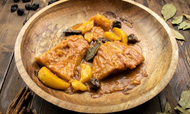 Αγιορείτικος μπακαλιάρος με πατάτες και δαμάσκηνα