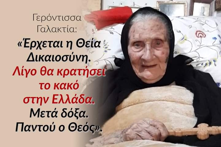 ΓΕΡΟΝΤΙΣΣΑ: «Πολλά… Δεν ξέρω να τα πω. Έρχεται αναμπουμπούλα. Ξεγυμνωσιά και βρωμιά στον κόσμο. Κανείς δε μιλάει. Έρχεται η Θεία Δικαιοσύνη. Λίγο θα κρατήσει το κακό στην Ελλάδα. Μετά δόξα. Παντού ο Θεός. Μετά κάθε μέρα δοξολογία στον Θεό. Κάθε μέρα… και μιά μέρα οι πιό πολλοί θα γονατίσουνε ενώπιόν Του…».