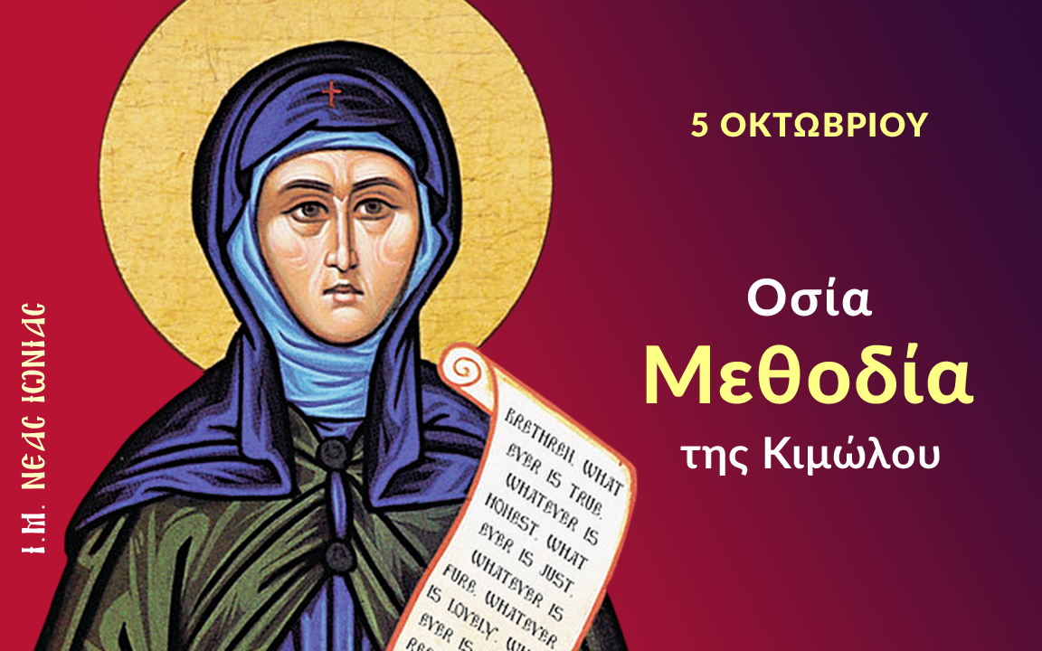Οι όσιες γυναίκες συναγωνίστηκαν επάξια τους οσίους άνδρες σε πνευματικούς αγώνες και αγιότητα. Η Εκκλησίας μας έχει να επιδείξει μια πλειάδα οσίων γυναικών, οι οποίες λαμπρύνουν το εκκλησιαστικό στερέωμα. Μια από αυτές υπήρξε και η αγία Μεθοδία η εν Κιμώλω. Μια σύγχρονη οσιακή σημαντική μορφή.