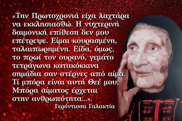 Την Πρωτοχρονιά είχα λαχτάρα να εκκλησιασθώ. Η νυχτερινή δαιμονική επίθεση δεν μου επέτρεψε. Είμαι κουρασμένη, ταλαιπωρημένη. Είδα, όμως, το πρωί τον ουρανό, γεμάτο τετράγωνα κατακόκκινα σημάδια σαν στέρνες από αίμα. Τί μπόρα είναι αυτή Θεέ μου; Μπόρα αίματος έρχεται στην ανθρωπότητα…».