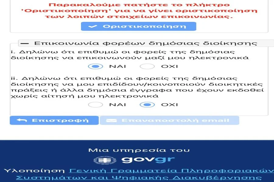 ii. Δηλώνω ότι επιθυμώ οι φορείς της δημόσιας διοίκησης να μου επιδίδουν/κοινοποιούν διοικητικές πράξεις ή άλλα δημόσια έγγραφα που έχουν εκδοθεί χωρίς αίτησή μου ηλεκτρονικά» όπου είναι προεπιλεγμένο το ‘ΝΑΙ’, θα πρέπει εσείς να επιλέξετε το ‘ΟΧΙ’ και στη συνέχεια να πατήσετε ακριβώς από πάνω «Οριστικοποίηση».