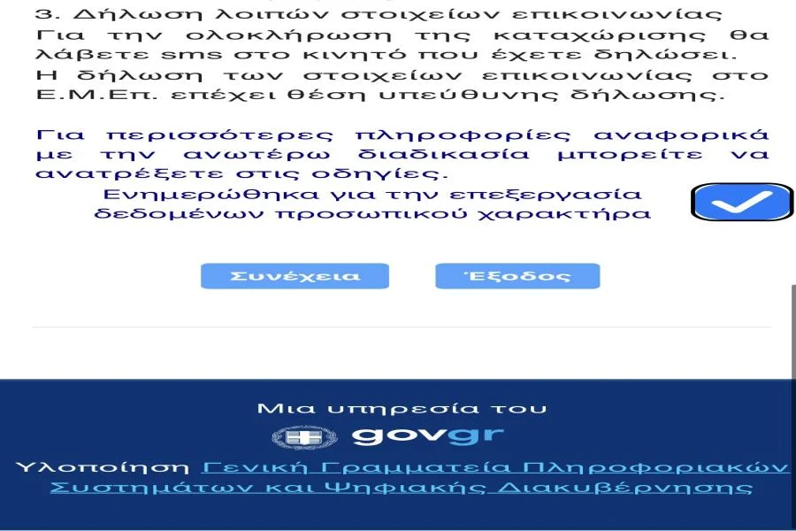 Τικάρετε πρώτα το στοιχείο «Ενημερώθηκα για την επεξεργασία δεδομένων προσωπικού χαρακτήρα» και πατάτε «επόμενο».