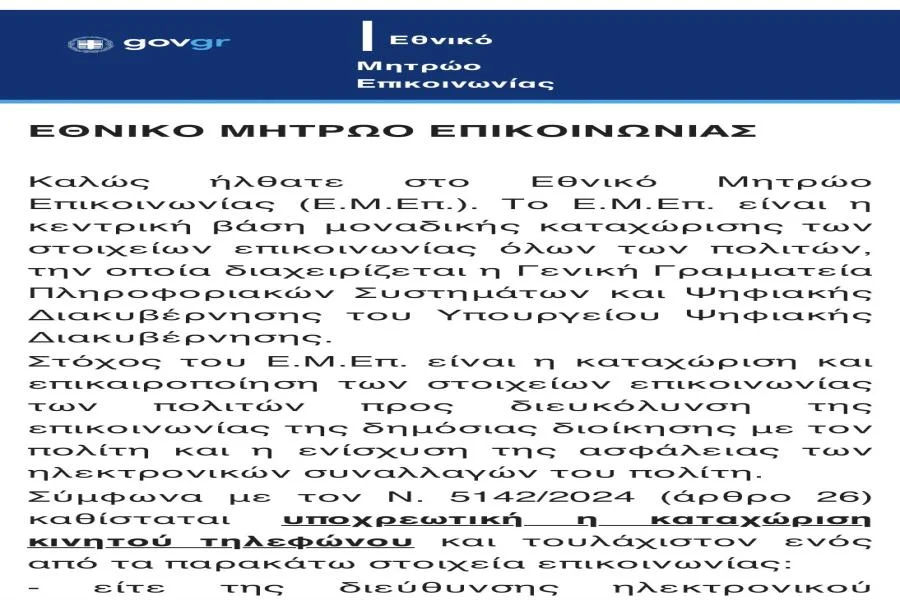 Όσοι ΔΕΝ επιθυμούν κάτι τέτοιο, θα πρέπει ΑΜΕΣΑ οι ίδιοι να εισέλθουν στο Έθνικό Μητρώο Επικοινωνίας (Ε.Μ.Επ.) και να το δηλώσουν ρητά έως το τέλος του έτους (31.12.2024) που είναι η διορία, μεταβαίνοντας στον παρακάτω σύνδεσμο: