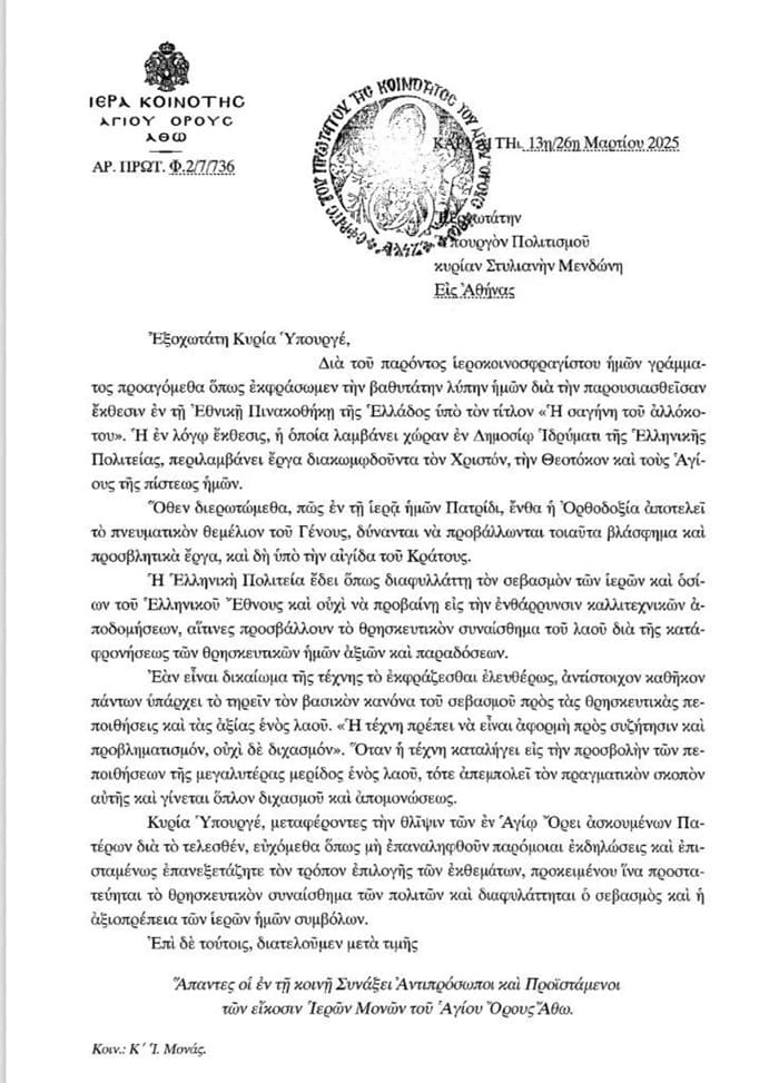 Με έντονο ύφος, η Ιερά Κοινότητα του Αγίου Όρους απέστειλε επίσημη επιστολή διαμαρτυρίας στην Υπουργό Πολιτισμού, κ. Λίνα Μενδώνη, για την πρόσφατη έκθεση στην Εθνική Πινακοθήκη, η οποία περιελάμβανε έργα που, κατά την κρίση των Αγιορειτών Πατέρων, προσβάλλουν βάναυσα το Ορθόδοξο φρόνημα και την πίστη του λαού.