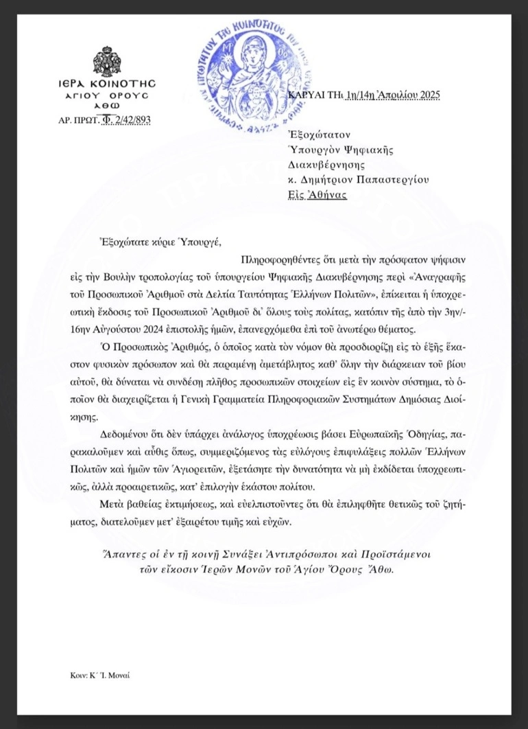 Η Ιερά Κοινότητα του Αγίου Όρους απέστειλε επιστολή στον υπουργό Ψηφιακής Διακυβέρνησης, Δημήτριο Παπαστεργίου, σχετικά με την υποχρεωτική έκδοση του Προσωπικού Αριθμού για όλους τους πολίτες.
