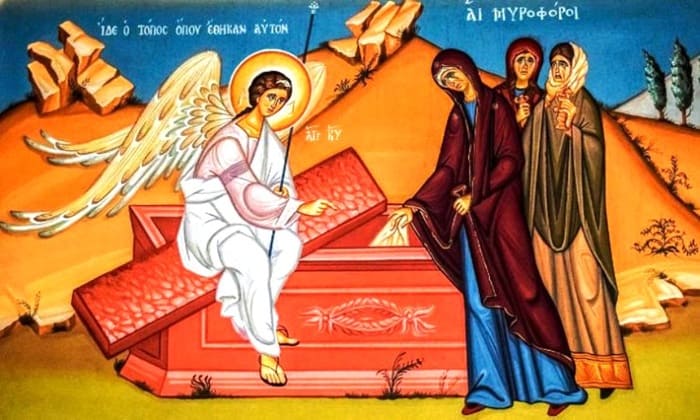 Όταν έφτασαν στο μνημείο τις περίμενε η μεγάλη έκπληξη: είδαν τον ογκόλιθο αποκυλισμένο από τη θύρα και πάνω του να κάθεται ο άγγελος της Αναστάσεως (Ματθ.28,1), ο οποίος τους ανήγγελλε το χαρμόσυνο νέο, ότι ο Ιησούς ο Ναζωραίος «ηγέρθη, ουκ εστιν ωδε, ίδε ο τόπος όπου έθηκαν αυτόν» (Μαρκ.16,6). Πήγαιναν να συναντήσουν νεκρό και διαπίστωσαν την ανάστασή του!