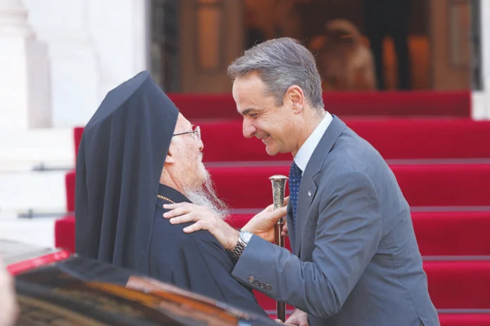 Συνάντηση με τον Οικουμενικό Πατριάρχη Βαρθολομαίο είχε χθες στο Μέγαρο Μαξίμου ο πρωθυπουργός Κυριάκος Μητσοτάκης στη σκιά των εξελίξεων αναφορικά με την Εκκλησία τη Κρήτης. Η τελευταία επίσημη συνάντησή τους είχε γίνει πάλι στο Μέγαρο Μαξίμου τον περασμένο Νοέμβριο, ενώ ανεπίσημα συναντήθηκαν πρόσφατα στο Βατικανό, καθώς και οι δύο είχαν παραστεί στην κηδεία του Πάπα Φραγκίσκου. Από αυτή τη συνάντηση χθες ο κ. Βαρθολομαίος έδωσε στον πρωθυπουργό κι ένα δώρο… μια φωτογραφία των δύο με την σύζυγο του κ. Μητσοτάκη, που τραβήχτηκε στην πλατεία του Αγίου Πέτρου!
