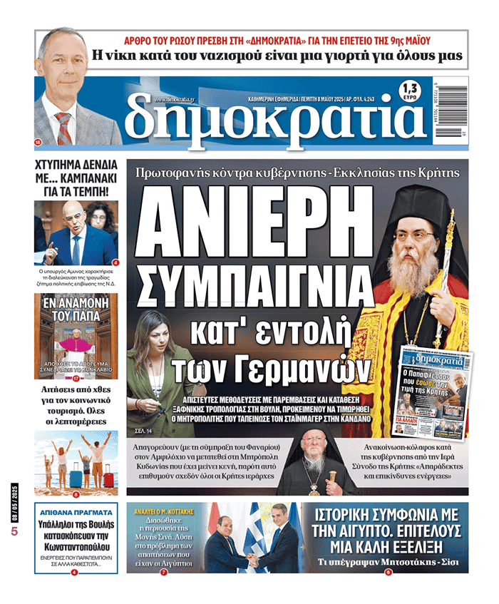 Σάλος έχει ξεσπάσει από τις αντιδημοκρατικές μεθοδεύσεις της κυβέρνησης, η οποία κατέθεσε και ψήφισε εν κρυπτώ τη διάταξη στη Βουλή προκειμένου να παρέμβει στην εκλογή του νέου μητροπολίτη Χανίων και να βάλει μπλόκο στον «μεταθετό». Το καυτό ζήτημα ανέδειξε η «δημοκρατία» με πρωτοσέλιδο αποκαλυπτικό δημοσίευμά της, το οποίο έφερε στο φως τις ακροβασίες του Μεγάρου Μαξίμου, που θέτει σε αμφισβήτηση όλο το καθεστώς της ημιαυτονομίας της Εκκλησίας της Κρήτης, ξεσηκώνοντας θύελλα αντιδράσεων. Αρχικώς, οι ίδιοι οι ιεράρχες της Κρήτης μιλούν για ωμή παρέμβαση προκειμένου να μην εκλεγεί συγκεκριμένο πρόσωπο.