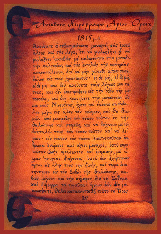 «… και μετά καιρόν ήλθεν η χάρις του παναγίου Πνεύματος και εκατοίκησεν έσω, και ηγιάσθη το Όρος με τον χαρακτήρα της Θεοτόκου έως τώρα· αλλά την σήμερον το εμόλυναν με τας φαύλας πράξεις της αδικίας αρπαγής και ακαθαρσίας, μέριμναν και θησαύρισιν, και ηβουλήθη να αναχωρήση· αλλά με ποίον τρόπον; Όρα καλώς· οχ οσιώτατοι πατέρες, η αναχώρησις της σωτηρίας είναι αύτη. ……..»