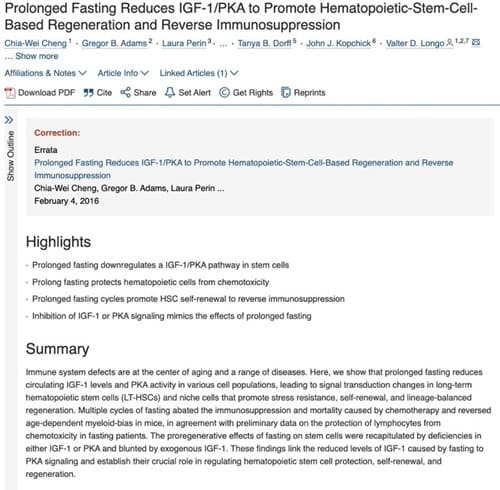 Μια μελέτη του USC του 2014 έδειξε ότι οι 72ωρες νηστείες πυροδότησαν την αναγέννηση των λευκών αιμοσφαιρίων με βάση τα βλαστοκύτταρα, ουσιαστικά επανεκκινώντας το ανοσοποιητικό σύστημα.