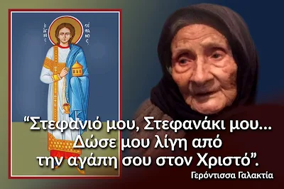 Γερόντισσα: «Έζησα το Μαρτύριο του Πρωτομάρτυρος Αγίου Στεφάνου! Τον αγαπώ πολύ. Τον προσκυνώ και του φωνάζω: “Στεφανιό μου, Στεφανάκι μου… Δώσε μου λίγη από την αγάπη σου στον Χριστό”. Φορούσε γαλάζιο ανοιχτό χιτώνα σαν αντερί δικό σας. Οι πέτρες βροχή… Γεμάτος πληγές. Θηρία οι κακούργοι. Όλα τα δαιμόνια είχαν μπει μέσα τους. Κοίταζε ατάραχος τον ουρανό. Ο Σαούλ κρατούσε τα ρούχα των φονιάδων. Αλλά κρατούσε και άλλα… είχε τα πόδια του σ’ έναν βράχο. Είδα και το Μαρτύριο των Αγίων Δέκα (των εν Γορτύνη 23 Δεκεμβρίου). Πέρασαν με χαρά από το σπαθί. Παλικάρι ο πρώτος αλλά πιό παλικάρι ο τελευταίος που έζησε τον αποκεφαλισμό όλων και δεν δίστασε».