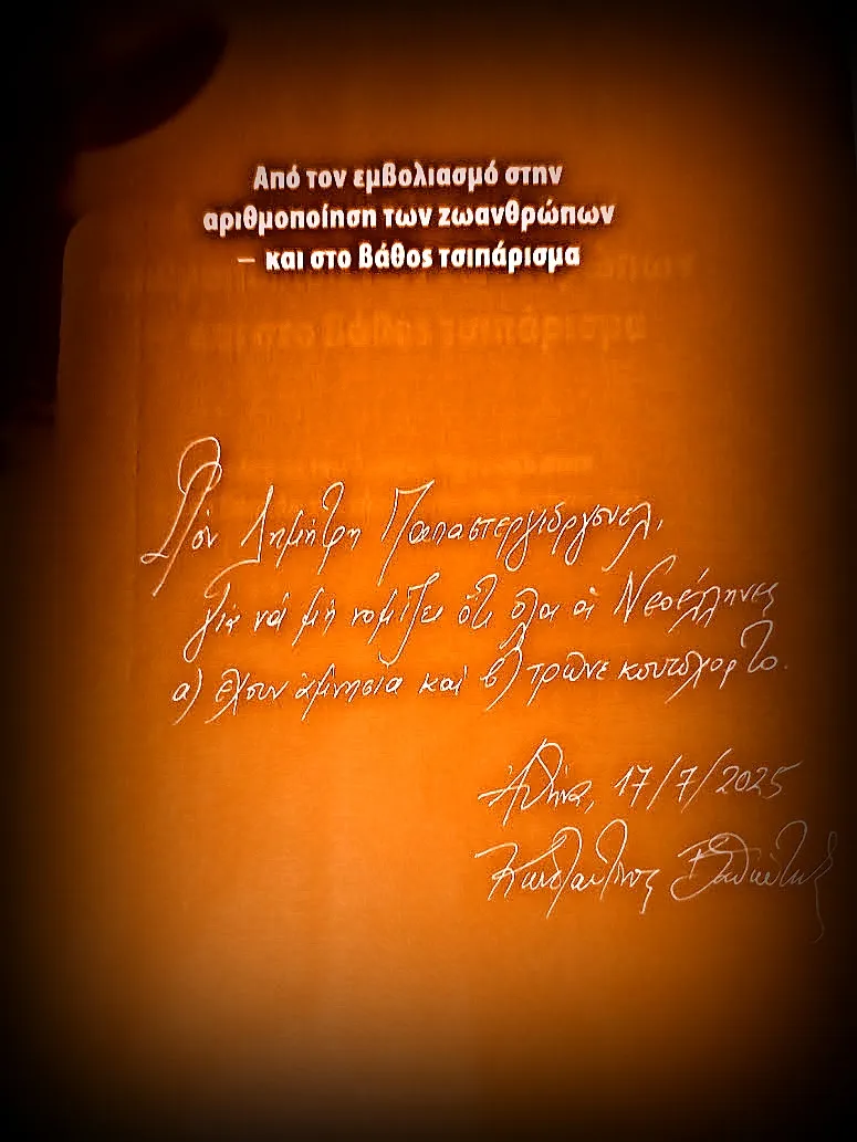 «Στον Δημήτρη Παπαστεργιόργουελ για να μη νομίζει ότι όλοι οι Νεοέλληνες α) έχουν αμνησία και β) τρώνε κουτόχορτο».