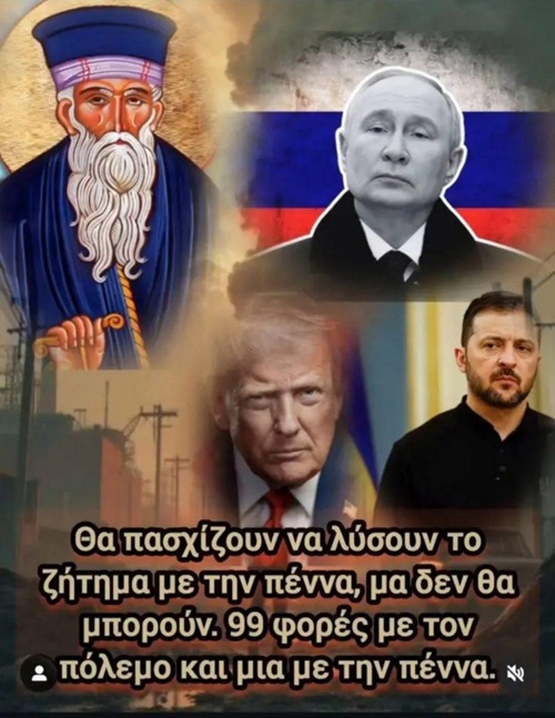 Η προφητεία του Αγίου Κοσμά «Θα προσπαθούν να το λύσουν με την πένα, μα δεν θα μπορούν – 99 φορές με πόλεμο και μία με την πένα» μοιάζει σήμερα ανατριχιαστικά επίκαιρη. Οι διαπραγματεύσεις για το Ουκρανικό ακολουθούν η μία την άλλη, αλλά αντί να φέρνουν ειρήνη, ανοίγουν τον δρόμο για νέα κλιμάκωση.
