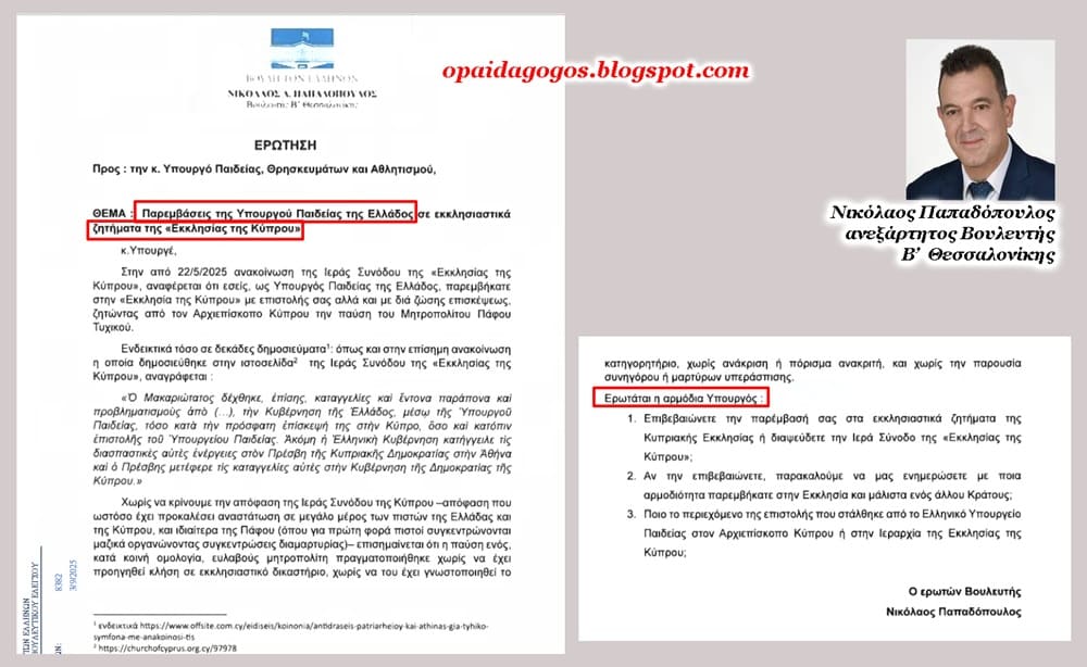 ΥΓ. Υπέβαλα ερώτηση στην Υπ. Παιδείας της Ελλάδος κ.Ζαχαράκη, για την επίσημη ανακοίνωση της Ιεράς Συνόδου της «Εκκλησίας της Κύπρου» που κάνει λόγο για παρεμβάσεις από την Κυβέρνηση της Ελλάδος δια της Υπουργού Παιδείας προς τον Αρχιεπίσκοπο Κύπρου τόσο με επιστολή όσο και δια ζώσης!