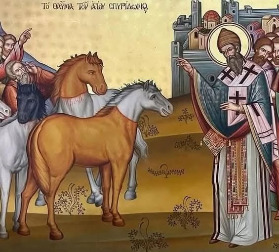 Όταν έφτασε ο Άγιος Σπυρίδων στον σταύλο, γύρισε προς τα άλογα που κοίτονταν νεκρά μες το σκοτάδι και ψέλλισε ”Να είσαι δοξασμένος Κύριε, Εσύ που έδωσες ζωή σε ολόκληρη την κτίση τώρα και στους αιώνες των αιώνων. Αμήν.”