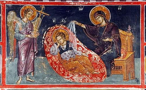 Ένα περιστατικό από τη ζωή του Χριστού ώς Θείου Βρέφους: όταν ή άγια οικογένεια διέφυγε από το ξίφος τού Ηρώδη, και πορευόταν στην Αίγυπτο, εμφανίστηκαν καθ’ οδόν κάποιοι ληστές, με πρόθεση νά κατακλέψουν τούς οδοιπόρους. Ό δίκαιος Ιωσήφ οδηγούσε το γαϊδουράκι, πάνω στο όποιο ήταν φορτωμένα τά λίγα ύπάρχοντά τους και όπου έπέβαινε ή Ύπεραγία Θεοτόκος, κρατώντας στο στήθος της τον Υιό της.