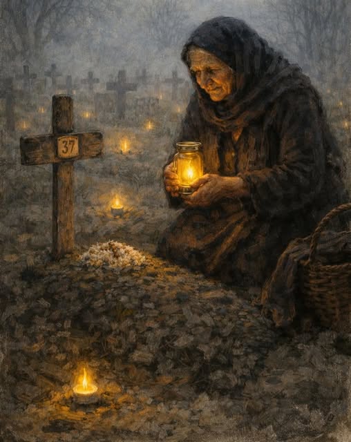 «Εδώ είσαι κι εσύ, πουλάκι μου», ψιθύρισε καθώς άφηνε μια χούφτα κόλλυβα πάνω στο χώμα. «Μην φοβάσαι. Όσο ζω εγώ, το σπίτι σου θα είναι φωτισμένο».