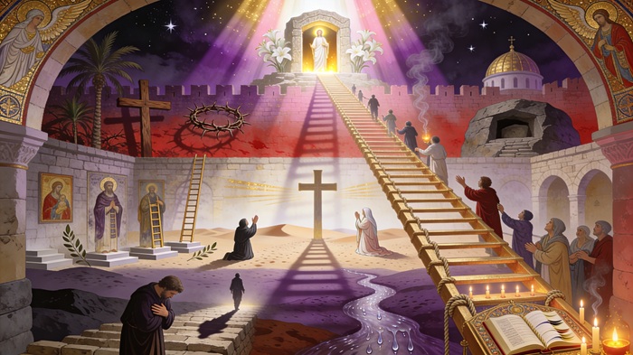 Στις επόμενες δύο βαθμίδες (Δ΄και Ε΄ Κυριακές των νηστειών), μας παρουσιάζει δύο ακόμη μεγάλες ασκητικές μορφές, τον άγιο Ιωάννη τον Σιναΐτη και την οσία Μαρία την Αιγυπτία, ως παραδείγματα τελείας ασκητικής διαγωγής. Έτσι μας διδάσκει, ότι δεν υπάρχει άλλος δρόμος θεραπείας της ψυχής από τα πάθη, παρά μόνον ο δρόμος της ασκητικής θεραπευτικής αγωγής, που υποδεικνύει η Εκκλησία. Τέλος στην τελευταία βαθμίδα (Κυριακή των Βαΐων), μας εισάγει στο πάθος του Κυρίου και εν τέλει μας οδηγεί στην φωτεινή ατμόσφαιρα της λαμπροφόρου Αναστάσεως.