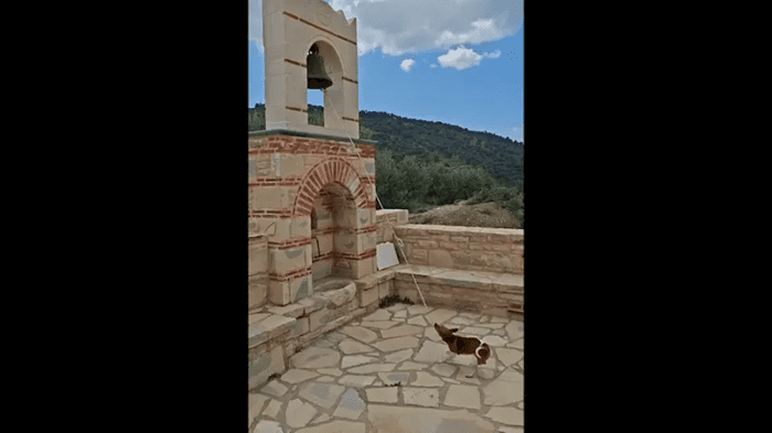 Σε ορεινό χωριό του Κρητικού νότου, ο ιερέας της ενορίας, παπά Γιάννης, έχει έναν…τετράποδο, εξαίρετο βοηθό για τα καθήκοντα του εξωτερικά του ναού, όπως η κρούση της καμπάνας, την οποία έχει αναλάβει το σκυλάκι της οικογένειας που αποδεικνύεται εξπέρ στο συγκεκριμένο καθήκον-με τις ευλογίες, υποθέτουμε και του Αγίου Μόδεστου, προστάτη των ζώων για την Εκκλησία μας…