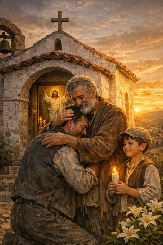 Ο Πέτρος τον σήκωσε, τον αγκάλιασε και του είπε: «Ο Χριστός αναστήθηκε. Κι εμείς, μαζί Του, αναστηθήκαμε σήμερα. Η αδικία πέθανε, η αγάπη ζει».