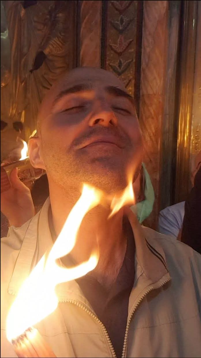 Ας δούμε τι λέει η τεχνητή νοημοσύνη όταν της ρωτήσαμε να αναλύσει την εικόνα αυτή απ την επαφή του Αγίου Φωτός με το πρόσωπο του πιστού που φέρνει τη φλόγα στο λαιμό του: