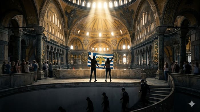 «Ορθοδοξία ή Θάνατος» μέσα στην Αγία Σοφία: Δύο Έλληνες συνελήφθησαν – Ύψωσαν την ελληνική σημαία με τον βυζαντινό αετό στην καρδιά της Κωνσταντινούπολης