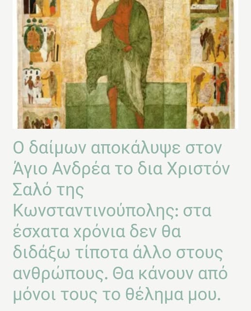 Ο δαίμονας που εμφανίστηκε στον Άγιο Ανδρέα τον δια Χριστό Σαλό της Κωνσταντινούπολης 10ος αι. μ.Χ προέβλεψε την πνευματική και ηθική αταξία των Χριστιανών, που επρόκειτο να διαφθείρει τον Χριστιανισμό στα έσχατα χρόνια: «Σε εκείνες τις εποχές, είπε ο δαίμονας, οι άνθρωποι θα είναι πιο πονηροί από εμένα και τα μικρά παιδιά θα ξεπεράσουν τους πιο ηλικιωμένους στην εξαπάτηση. Τότε θα αρχίσω να ξεκουράζομαι! Δεν θα διδάξω τίποτα άλλο στους ανθρώπους. Θα κάνουν από μόνοι τους το θέλημα μου. (Άγιος Ιγνάτιος (Μπριαντσιανίνωφ), ”Έργα”, τ. 3, c. 244.) ΄Ώστε ..καθηγητής.. ειδήμονας ο διάβολος.. και είναι σίγουρο πως θα έχει και πτυχίο από πανεπιστήμια της ελίτ.. Θα ξεκουραστεί θα γίνει επίτιμος διδάκτωρ….Θ΄αναλάβουν οι πάσης φύσεως ακριβοπληρωμένοι ειδήμονες των μηχανισμών…Στρατολόγηση, στελέχωση και επί το έργον…